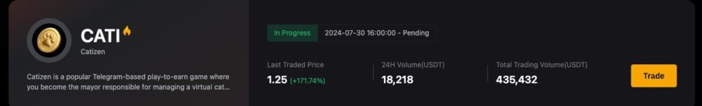 KX 宣布将于 9 月 20 日下午 6 点上缐 CATI(CATIZEN)现货交易,短期内涨幅突破 171%,目前价格1.25USD,预估市值超 12 亿美金。