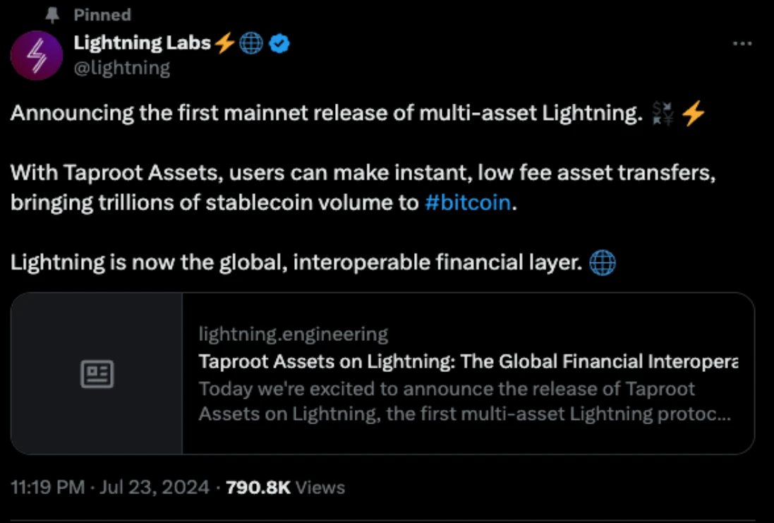 2024 年 7 月 23 日,Lightning Labs 发布了多资产闪电网络的第一个主网版本,正式将 Taproot Assets 引入闪电网络。这一里程碑事件标志着稳定币正式在闪电网络上得到支持!
