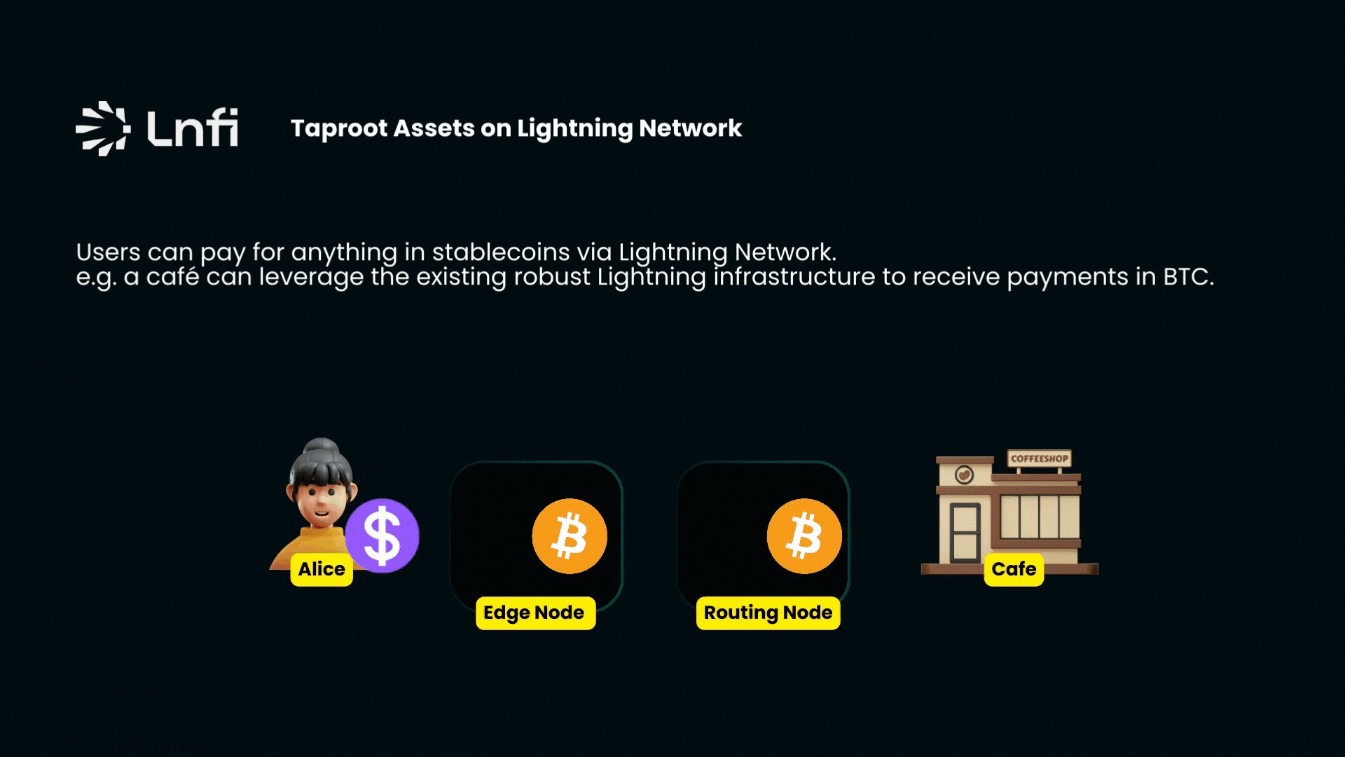 目前,像 Nubank、Shopify、PickNPay、NCR、Blackhawk、Clove 和 Bitrefill 这样的商家和平台已经支持闪电网络支付。甚至像 Pubkey@NYC 和 JooBar@SG 这样的有趣小企业也已加入闪电支付的行列。通过现有的闪电网络,无需对现有基础设施进行任何升级,稳定币可以轻松用于这些支付场景。如 Alice 买咖啡的场景,咖啡馆接收比特币。