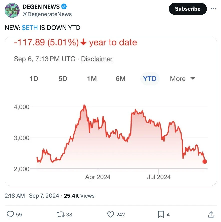 在本期通讯中,我们将探讨 Vitalik Buterin 最近对 DeFi 兴趣减退的评论,$ETH 当前表现不如 $BTC 及其他竞争对手,以及关于 $ETH 是否面临身份危机的问题,例如它是作为“超声波货币”还是受制于某些 L2 的蚕食。截至目前,$ETH 年初至今下跌了 5% ,这突出显示了这一问题。支持 ETH 的群体和加密领域的其他人士在讨论什么算作以太坊时,常常在语义上存在分歧。无论 L2 是否被视为以太坊的一部分,Arbitrum 和 Base 等 L2 的发展对 $ETH 作为一种资产并没有带来显著的好处。在加密货币领域,人们通常通过价格来验证叙事,因为这直接关系到他们的盈利能力。