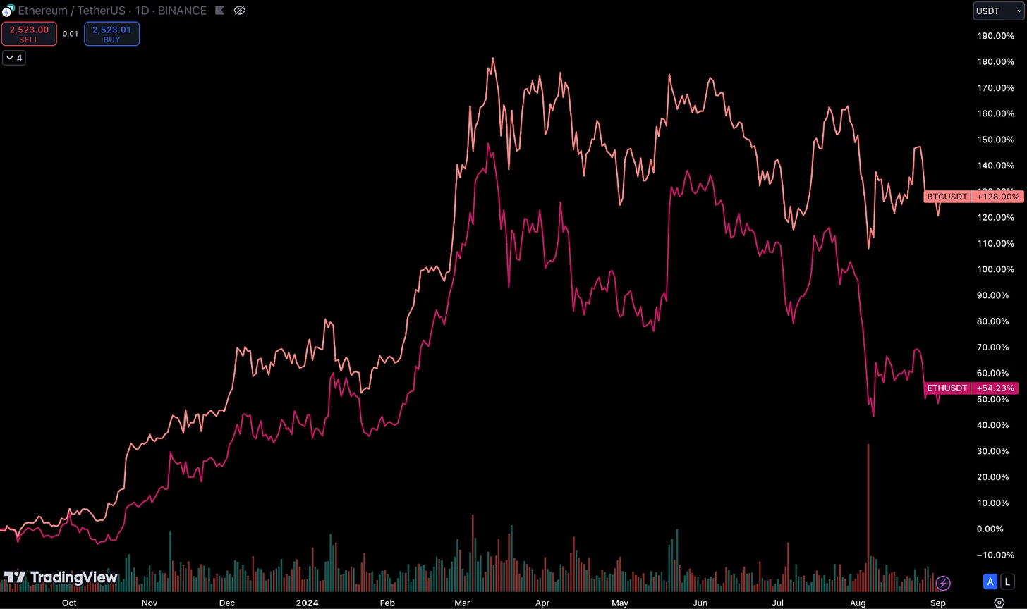 加密货币并非孤例:有多少美国最有价值的公司会支付股息?股息曾是公司上市的核心吸引力,但现在大多被类似“更大傻瓜理论”的策略所取代。即使是黄金,其本质上也具有高度投机性,因为相对于其市值,黄金在半导体和其他设备中的实际用途微乎其微。因此,在市场中,尤其是在通货膨胀的法币制度下,投机的作用不可小觑。不论怎么看,$ETH 最近的价格表现只能说是令人失望。这不仅在加密货币领域如此,而且近年来多种美国大盘股的表现也超过了以太坊。