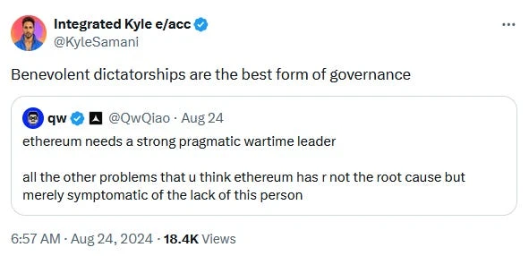 Vitalik Buterin 最近关于 DeFi 的评论在加密货币和以太坊社区引发了热烈讨论。Vitalik 认为,目前的 DeFi 形式是不可持续的,他将其比喻为“咬尾蛇”(Ouroboros),即自我吞噬的状态。这一情况突显了以太坊生态系统中的领导力问题。与其他拥有明确领袖的竞争对手不同,以太坊由于其去中心化的特性面临独特的挑战。在与其他区块链竞争时,缺乏一个明确的市场宣传代言人。虽然 Vitalik 是一个拥有真实身份的思想领袖,但他不像 Do Kwon 曾在 Terra 社区中那样积极倡导(或许这背后有其原因),也不像 Anatoli 在 Solana 中那样强势(Solana 的表现优于 $ETH,并且吸引了大量的普通投资者)。
