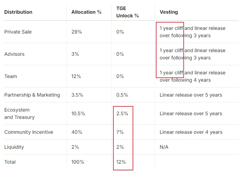 根据 官方文档 , 协议代币 SHELL 共 10 亿枚,SHELL 将在 TGE 时将解锁 12% 代币,分别为社区激励 7% 、流动性 2% 、生态系统 2.5% 、营销 0.5% ,团队和投资者代币将在 1 年的 Cliff 期后线性释放,其他代币在 TGE 后开始线性释放。