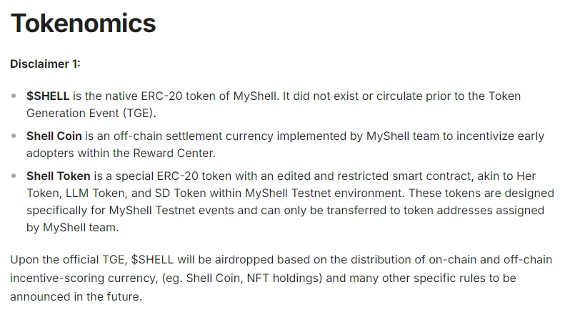 MyShell 在 官方文档 中明确了将有协议代币,并根据协议链下货币 Shell Coin 和 NFT 持有情况等条件进行空投。原文如下: