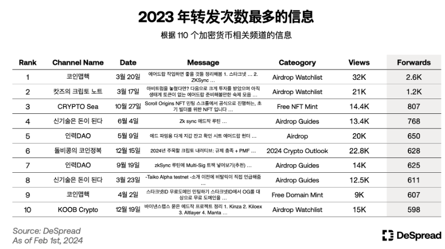 再看,2023 年韩国加密社区转发次数最多的信息排行榜,发现大家关注的都是同一个话题——撸空投。