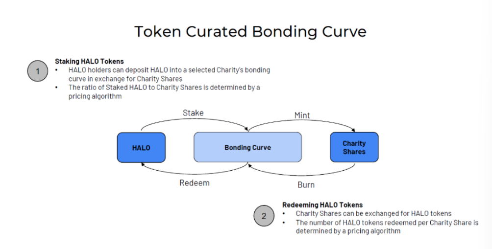 著名研究机构 Delphi Digital 曾为基于 Terra 构建的慈善捐赠协议 Angel Protocol 构建了以 Bonding Curve 为基础的代币经济模型。在协议中有三个角色,分别为捐赠者、慈善机构和慈善支持者(HALO 协议代币质押者,在慈善市场中进行策展)。协议的目标是将捐赠与 Bonding Curve 相结合,增强慈善事业的可持续性。