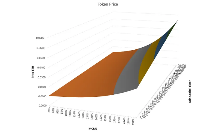 协议内所引入的一个重要参数为最小资本下限(Minimum Capital Floor,MCF),对应现有的协议内基金产生了一个比率,一般称之为 MCR%。而对于链上互助性保险协议的可持续性发展而言,需要一个权益通证(在协议内对应 NXM)和协议权益总量之间的对应关系,继而实现协议的有机规模增长。原先在协议内,MCF 是通过治理决定的。而在 2019 年 11 月,社区治理决定将 MCF 的调控实现自动化。在当日 MCR% 值大于 130% 时 MCF 会小幅增加 1% 。