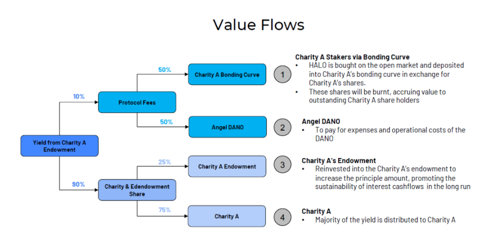 从价值流层面进行分析,从慈善捐赠基金中产生的收益分为股份分配(90% )和协议费用(10% ),其中股份分配方面, 75% 的分配流向慈善机构, 25% 用于捐赠基金的在投资,从而促进现金流的长期可持续性。而协议费用则评分给了 DANO(协议的治理组织)和 HALO 质押人。