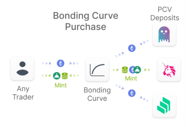 其中为了创造协议持有价值(PCV)并接受新需求,Bonding Curve 便成为了一个绝佳的方案,并且其拥有数学上的公平性。具体而言,在缓冲区以外的价格可以通过在 Bonding Curve 中进行铸造来平衡,且该曲线为单向买入曲线。另外对于 PCV 的通用融资与部署,这部分资金可以通过以其他代币计价的额外 Bonding Curve 获得,并直接部署到链上各协议中。例如协议在启动时基于 Uniswap ETH-FEI 流动性池建立了唯一的曲线,后续又添加了多个 DeFi 协议的流动性。而每一个 Bonding Curve 对应单个协议的「锚定」(流动性),灵活的设计允许 PCV 进行新的创造性部署,并与未来潜在的新 DeFi 协议集成。