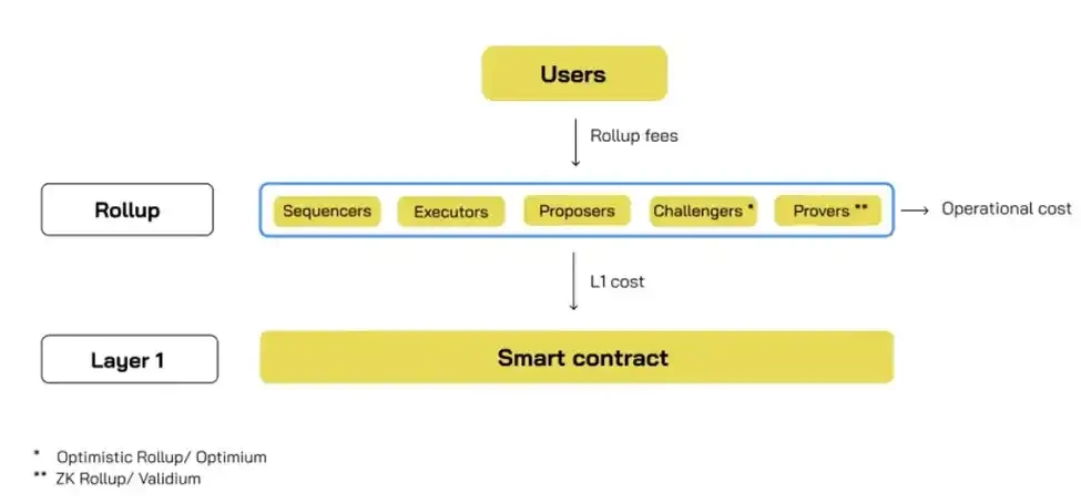 以太坊等基础层网络通常因大多数节点需要同步和验证链而对计算和存储收取更多费用。然而,在 Rollup 中,即使只有一个诚实实体能够验证链,该链也被认为是安全的。因此,Rollup 对计算和存储的收费较低,但对 rolling up 交易到打包并发布到 L1 的费用较高,导致 L1 成本在 EIP 4844 推出前,占到 L2 成本基数的 98% 。