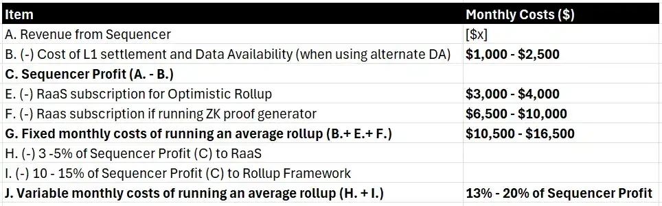 尽管在行业层面和个别链层面进行了各种优化,仍需要每月总计 10, 500 至 16, 500 美元的费用用于 ZK Rollup,以及 4, 000 至 6, 500 美元用于 Op Rollup,此外一旦链开始盈利,排序器利润还需分享多达 20% 。