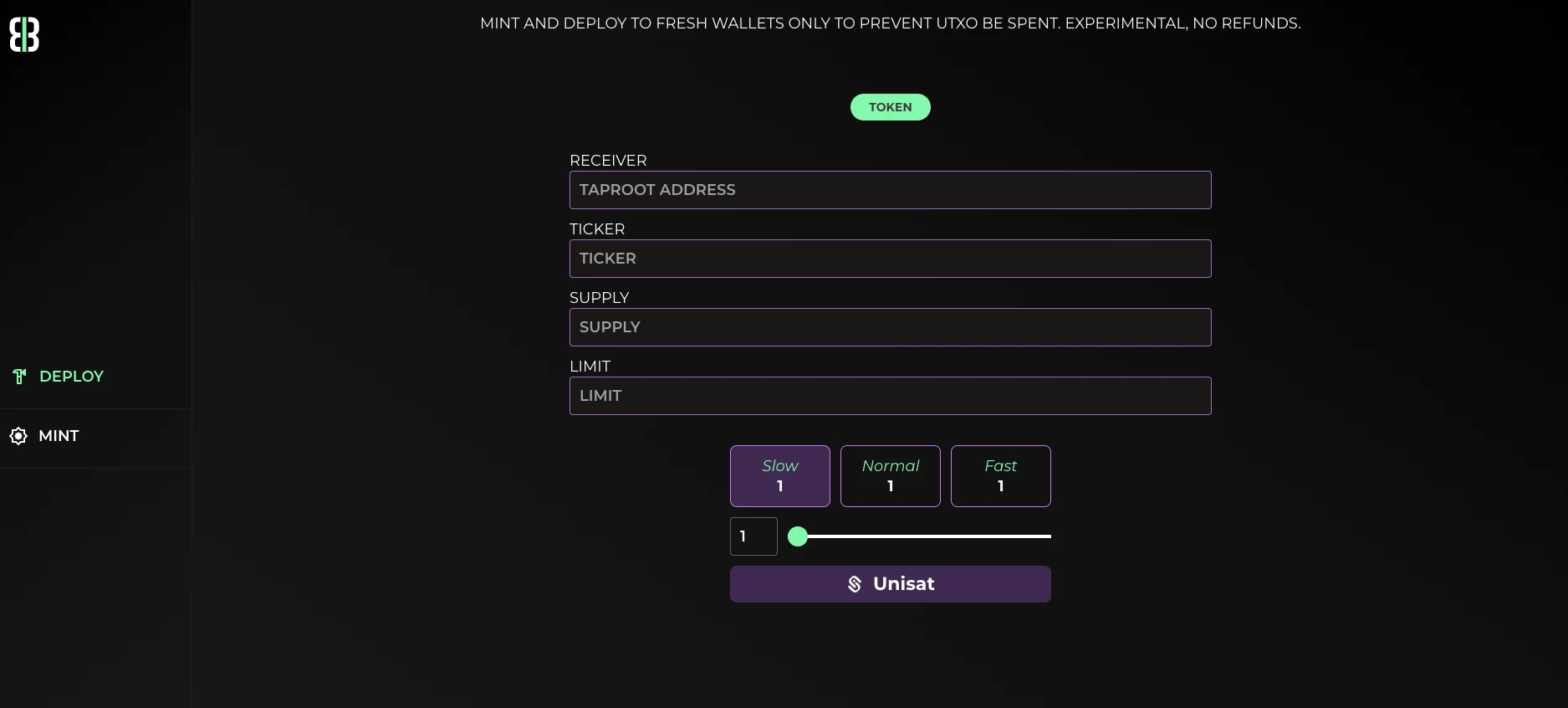 整体上看,该铸造网站也较为简陋,玩家的处境较为被动。比如,无法查看当前已经部署可以铸造的资产及铸造进度等;如果不填入任何内容,直接点击下方“Unisat”键也直接弹出钱包支付窗口导致错误支付;网站上方也有“实验性,不退款”的提示字样,请参与的玩家务必注意风险。