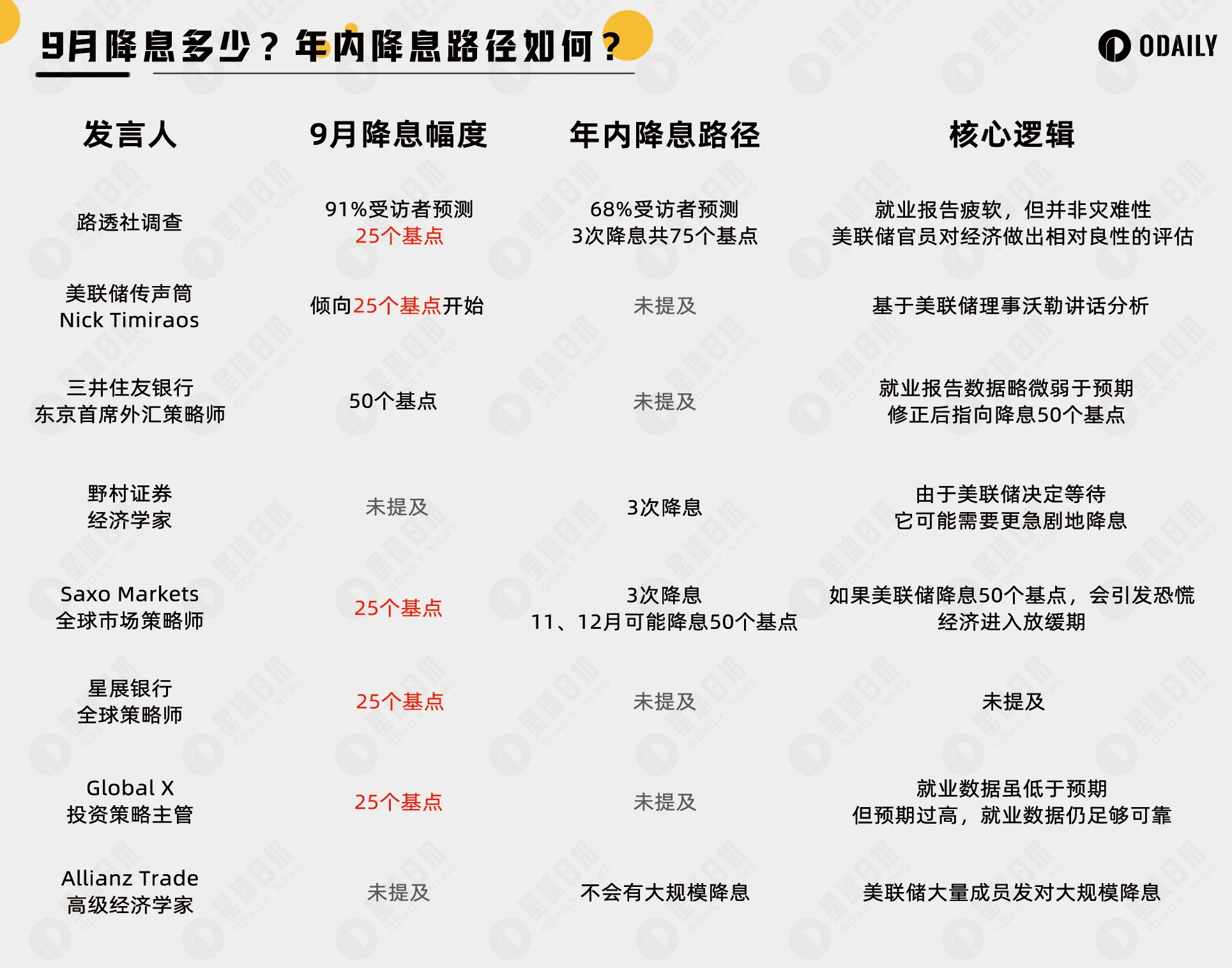 9 月 19 日(下周四) 02: 00 将公布美联储利率决定,降息已成板上钉钉之事,但 9 月降息幅度如何仍悬而未决,当前市场普遍认为若美联储选择降息 50 个基点,暗示着经济衰退风险。机构如何看待 9 月降息幅度,又对降息后的市场走势如何预判?Odaily 将于本文汇总解答。