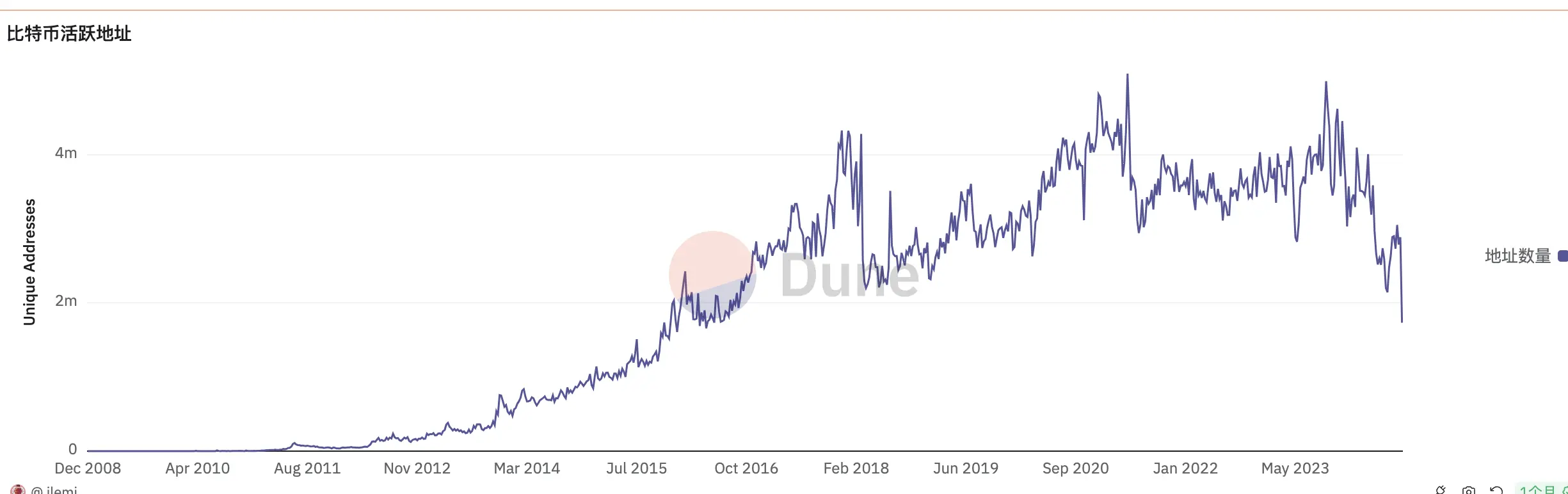 根据 Dune 数据,比特币活跃地址数量较今年减半发生前有较大幅度的下降,这可能表明市场情绪正在降温。