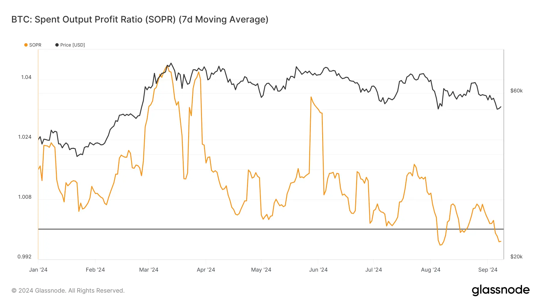 根据 Glassnode 数据,比特币 7 天移动平均线 SOPR(已花费产出利润率 )已跌破 1.0 ,这代表市场卖家在区块链的交易目前仍是盈利的,但需要指出的是,从历史上看,SOPR 往往会在市场整合发生之前跌至 1.0 以下。当前的下跌与 2018 年和 2019 年的熊市阶段相似,SOPR 长期低于 1.0 ,市场可能会出现逆转。