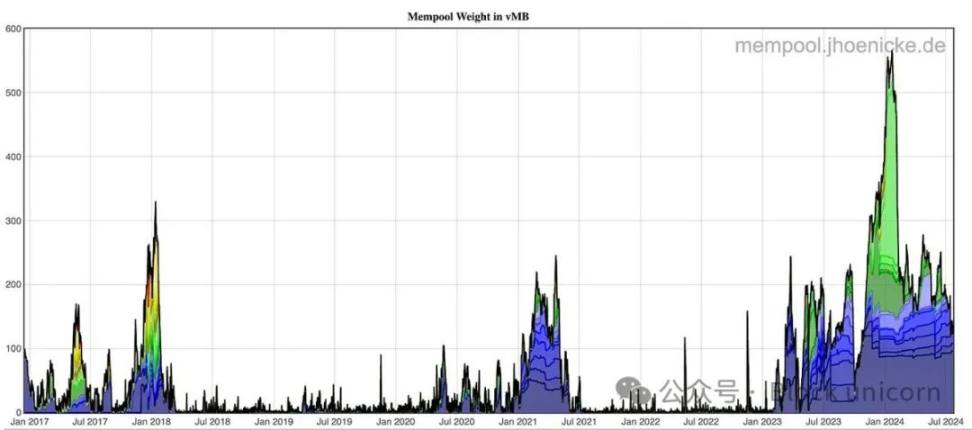 比特币是全球分布最广的数字资产,拥有超过 4.6 亿个独立钱包。自从 Ordinals 和铭文(inscriptions)出现以来,比特币的需求明显增加。2022 年 12 月 19 日,比特币的 Dick Butt(上图)成为首个在比特币上刻写的铭文。从那时起,比特币的内存池(mempool)使用率平均超过 50% (下图),远高于以往,甚至达到了 2021 年牛市周期的两倍。这表明对比特币区块空间的需求非常强劲,但也导致交易费用上升到普通用户难以使用链的程度。
