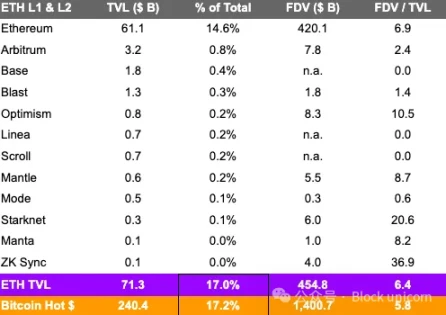 比特币的热钱占总价值的比例与以太坊的总 TVL 相似,通过在比特币上实现可编程性,这部分价值可以被释放。以太坊 L1 和 L2 的总 TVL 为 710 亿美元,占以太坊总价值的 17% 。不同于以太坊,比特币的热钱大部分处于未充分利用状态,主要存放在 CEX 和 ETF 中。有理由相信,原生于比特币的金融工具可以显著提高其利用率。