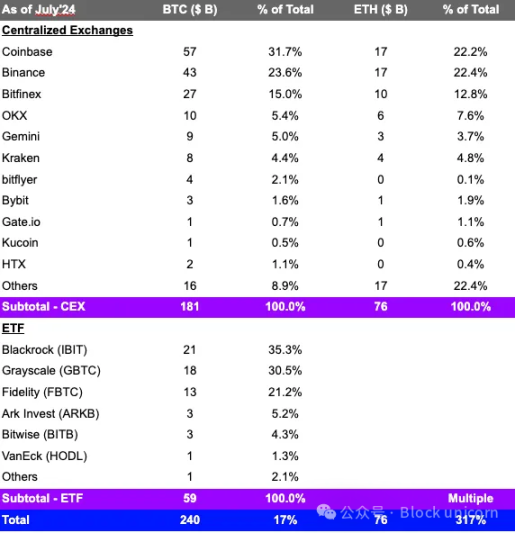 比特币的热钱在 2024 年 1 月至 7 月期间增长了 23% ,在此期间,CEX 上的比特币供应量从 290 万减少到 270 万,而 ETF 中的比特币供应量增长到 89 万,导致净增 68 万比特币。根据 ETF 持有者和 CEX 热钱流动的统计,这主要是由个人投资者资本推动。