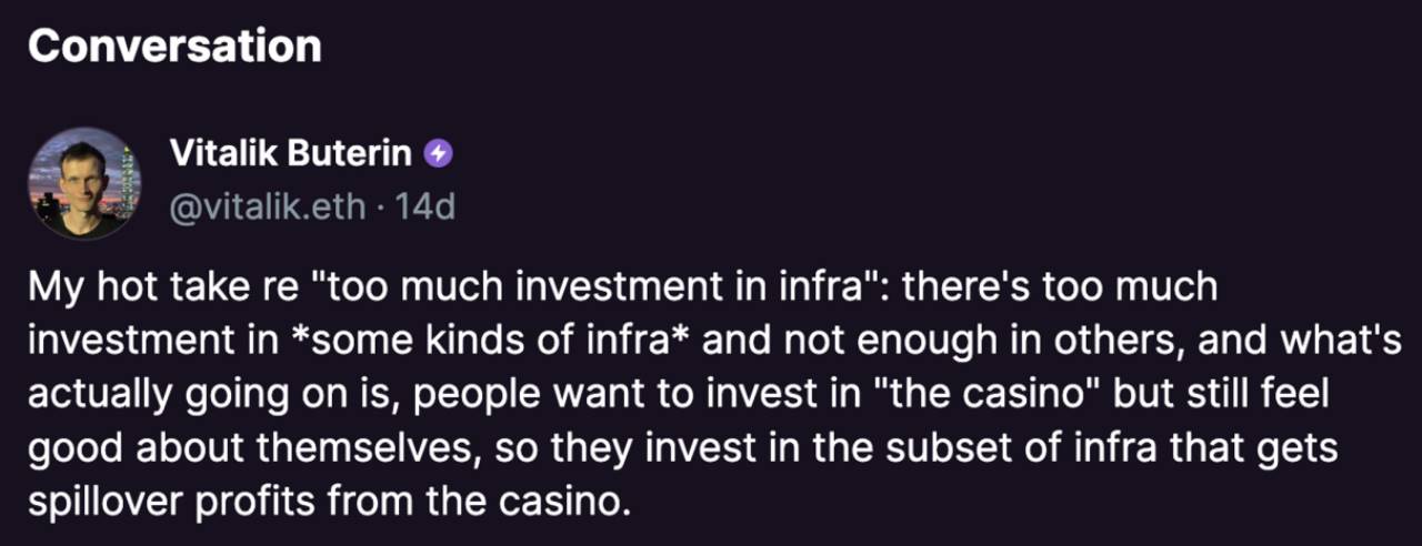 2024 年 7 月,以太坊创始人 Vitalik Buterin 发表了一篇文章,批评当前区块链行业在基础设施上的过度投入。Vitalik 指出,这种过度投入源于投资者间接地将资金投向技术方面,而非直接投资于代币,以安慰他们的道德良心。他的观察似乎与 L2 项目的无序涌现相契合。由于大量资金流入基础设施,出现了一些仅专注于利润而非以太坊可扩展性叙述的项目,使得以太坊及其可扩展性问题逐渐淡出 L2 叙述。