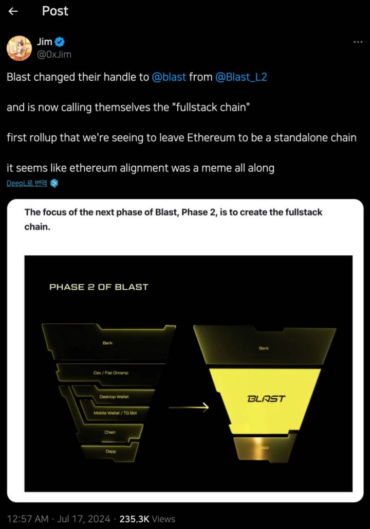 例如, Blast 于 2024 年 2 月 29 日上线其主网 ,最初强调其作为以太坊 L2 的定位和理念。然而,某个时候,它开始自称为“全栈链”,逐渐与以太坊保持距离。Blast 在 X(前身为 Twitter)上的官方账号从 @Blast_L2 改为 @blast,这并非偶然。
