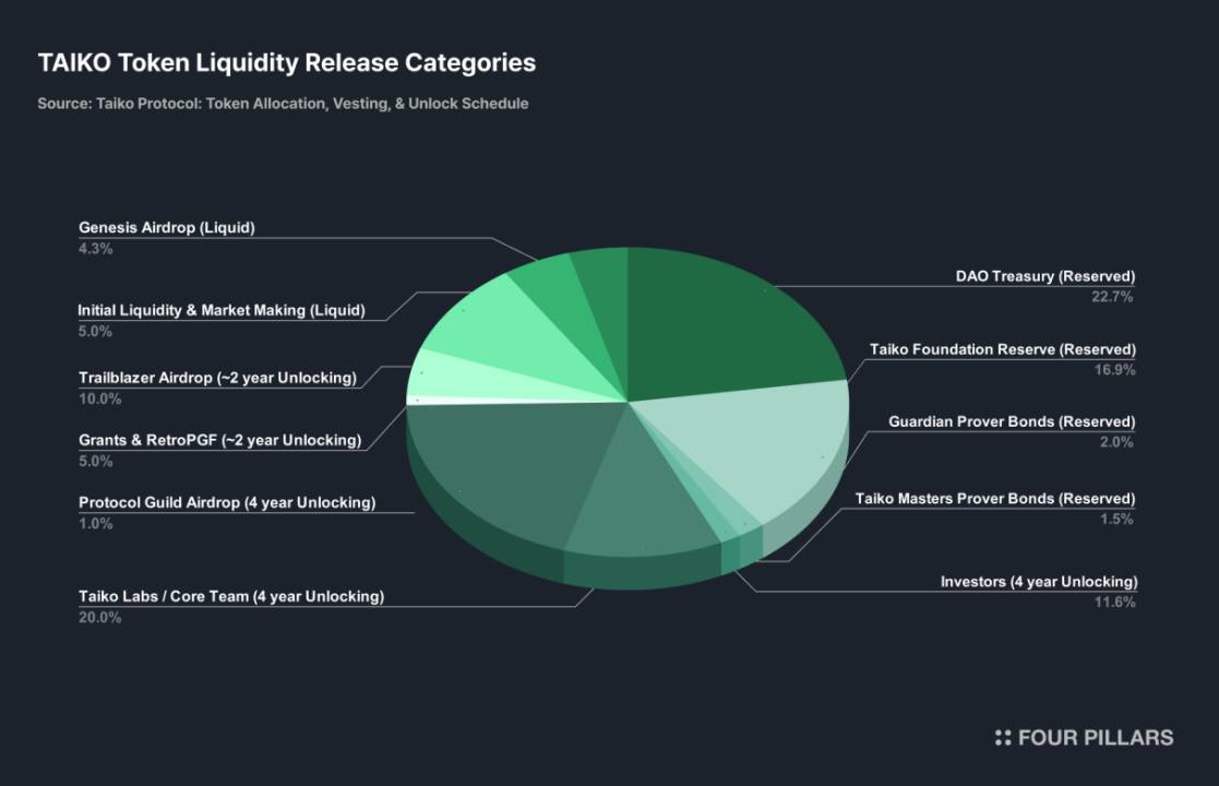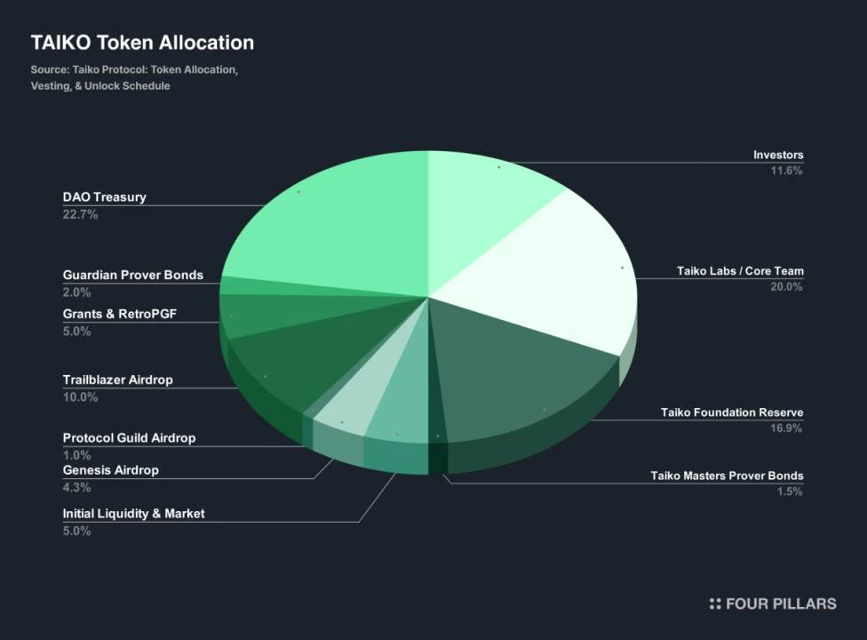 这个 DAO 将被开发为 Taiko 协议的治理机构。TAIKO 代币持有者将拥有投票权,可以参与智能合约升级和其他网络相关问题的决策。这样的民主结构确保社区集体控制 Taiko 协议的所有智能合约方面。此外,Taiko 金库由 DAO 负责管理,处理 Taiko 协议产生的收入,确保财务资源被适当地分配,以支持协议的持续发展和运营需求。