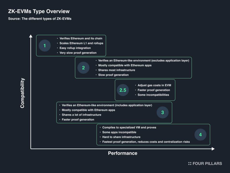 2022 年 8 月 4 日,Vitalik Buterin 发布了 The different types of ZK-EVMs ,对 zkEVMs 进行了分析和分类。根据他的分析,zkEVMs 被分为 Type 1、 2、 2.5、 3 和 4 ,数字越高意味着与以太坊的互操作性和兼容性越低,但在生成证明和整体性能上效率更高。换句话说,数字越高的 zkEVM 类型涉及的更改包括修改 EVM 核心或引入额外模块以优化性能。