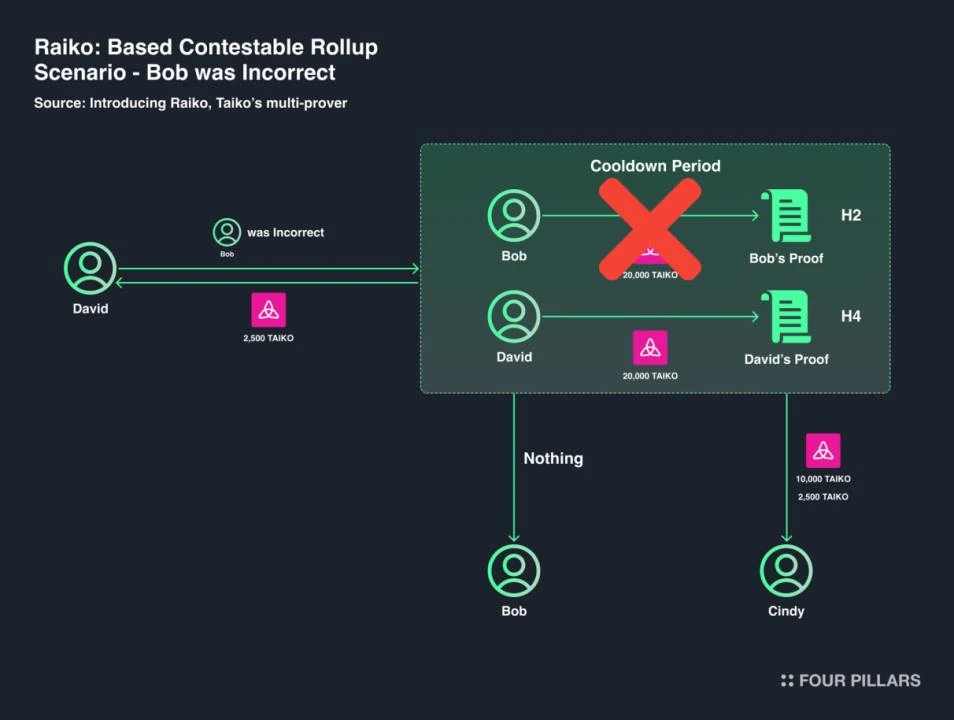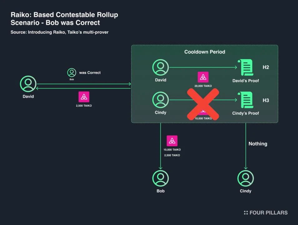 David 提供了一个从 H 1 → H 4 的三步转换证明,证明 Bob 的转换是错误的。David 因此获得 2, 500 TAIKO 作为奖励,并质押 20, 000 TAIKO 作为押金,为他的修改状态信息和证明提供资本支持。