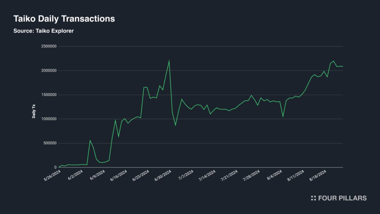 Taiko 的主网在网络活动方面取得了增长,实现了超过 1 亿笔交易。这种活动激增进一步体现在网络每天处理多达 2, 000, 000 笔交易,体现了其强大的容量和日益增长的采用率。不断扩大的用户基础通过吸引超过 1, 000, 000 个独特钱包地址得以体现,反映了用户对 Taiko 生态系统的强烈兴趣和参与。