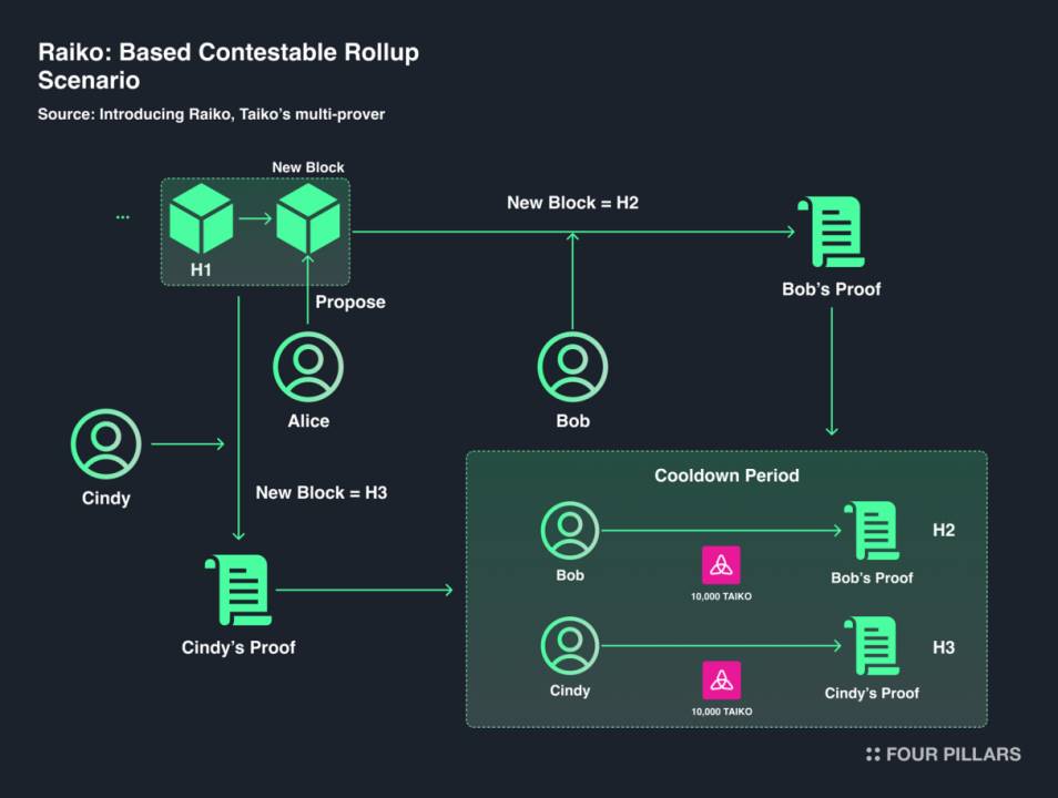 Cindy 认为 Bob 的状态变化应该是 H 1 → H 3 ,而不是 H 1 → H 2 。Cindy 在冷静期内质押了她的 10, 000 TAIKO 作为竞争性保证金,并对 Bob 的证明提出挑战。
