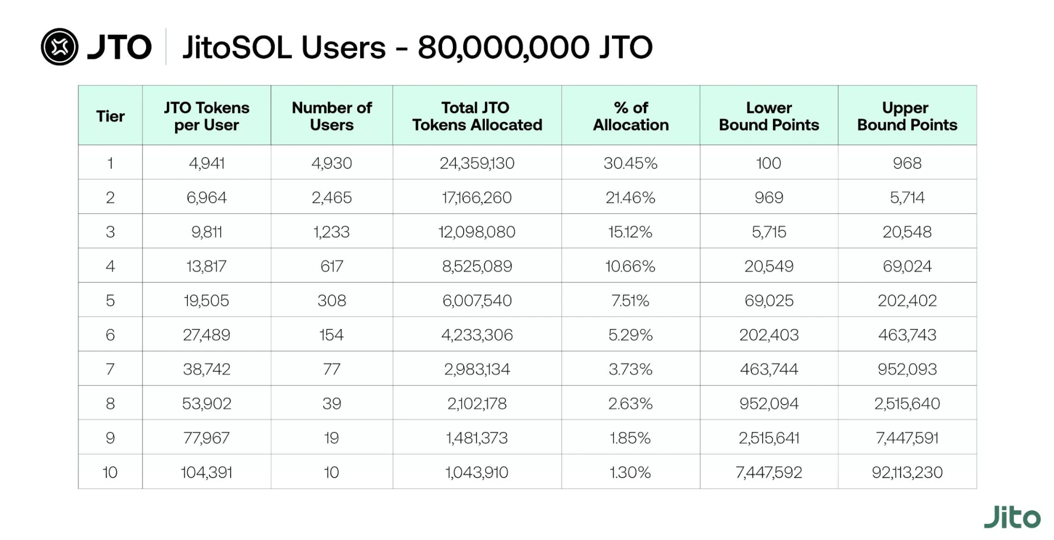 JitoSOL 用户的空投资格系根据 Jito 积分计划的排名决定,只有积分等于或超过 100 分的 JitoSOL 用户才符合空投要求,最终确定了十个级别的分配标准。