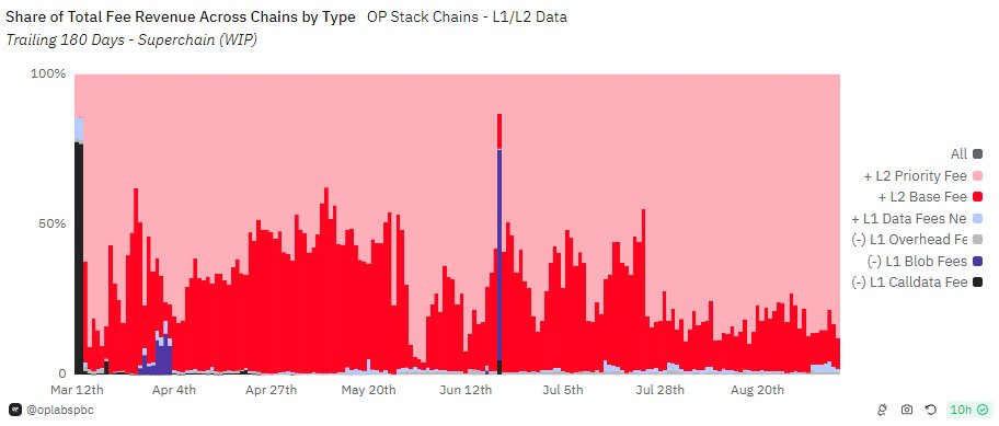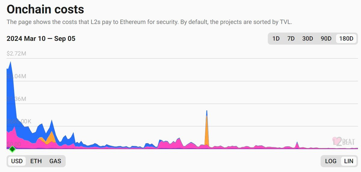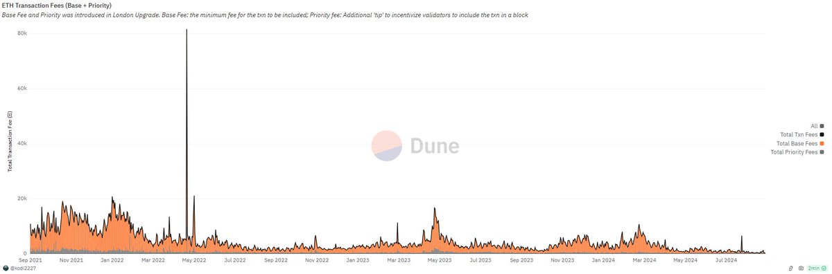 目前,L2 的基础费用相对于优先费用而言过低(如下图所示)。 在理想情况下,基础费用与优先费用的比例应增加,以达到类似于过去几年在以太坊 L1 上的水平(见下图)。