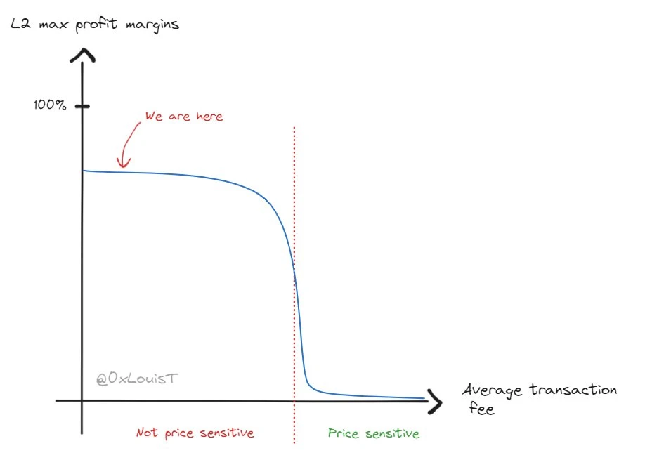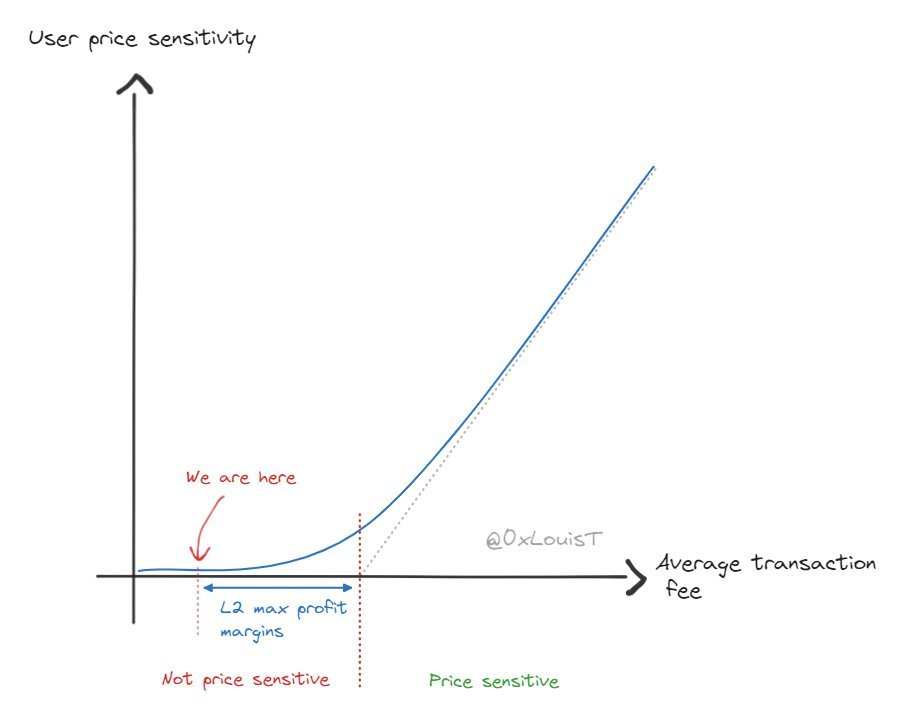 虽然 ETH 仍然具有定价权,但目前的情况就像汽车在低档位行驶。如果 L2 从用户费用中赚取了大量利润,这说明以太坊的定价可能过低。 问题的根源在于整个网络的费用设置过低。当费用仅为几美元或几美分时,用户对价格通常不敏感。然而,如果所有 L2 的活动增加,费用会逐渐上升,直到达到一个用户开始关注的临界点(如下图所示)。