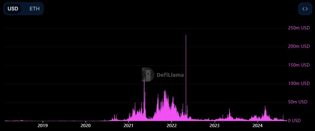 1. ETH 收入锐减: 以太坊对此负有责任,原因在于其扩展路线图。然而,这并不意味着失败。以太坊的扩展计划旨在通过降低费用和提高吞吐量来实现用户数量增长 100 倍。计划是让 L2 上的交易费用降低 100 倍,这一目标已经实现。然而,即使费用大幅下降,用户数量并没有如预期增长,反而自 2021 年以来不断减少。即便费用降低了 100 倍,若能伴随 100 倍的活动量,收入自然会稳定,ETH 的收入也能回到之前的水平。因此,我们需要将 ETH 的用户数量增加 100 倍。