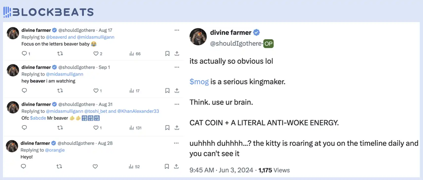另外,divine farmer 在推出 abcde 之前还曾是 meme 币 mog 和 wojak 的忠实社区成员,曾频繁发布相关内容并与 meme 社区进行互动,这也在一定程度上为其运营 abcde 项目奠定了不错的「路人缘」。