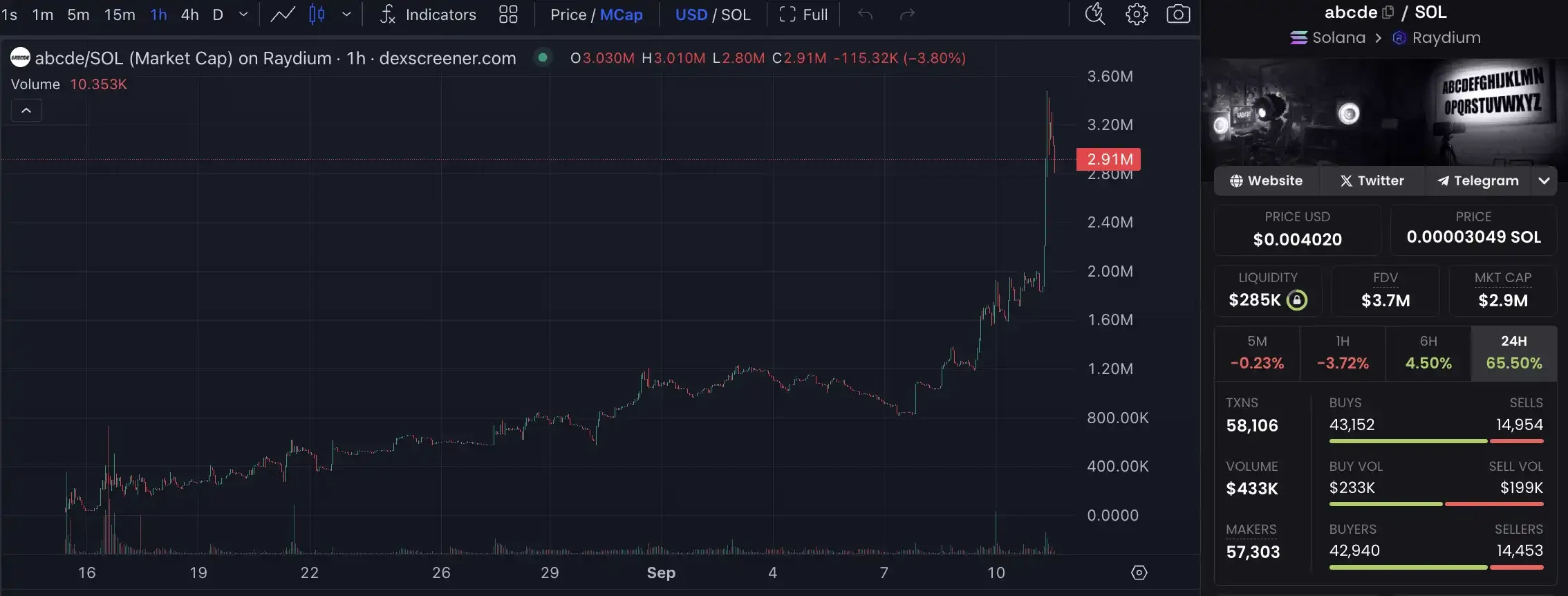 BlockBeats 在今日更新的《 Alpha 早报| 9 月 11 日你需要知道的所有市场动向及资讯 》中提到了 meme 币$abcde,其上线不到一个月涨幅超 50 倍,近四天涨幅达 3 倍,最高市值 340 万美元。
