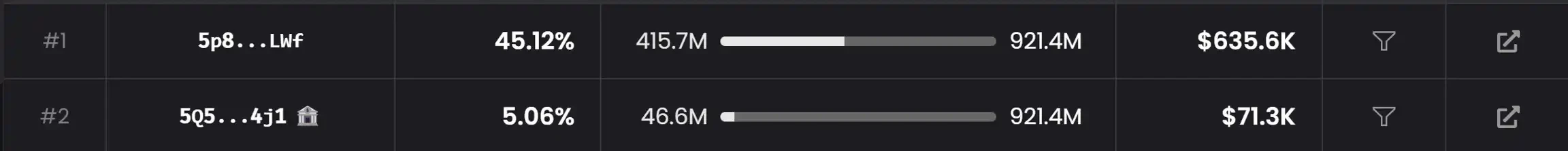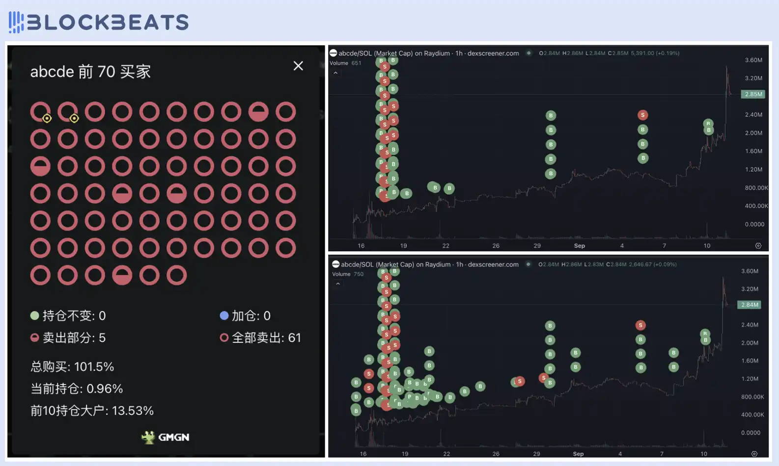 根据 gmgn 和 Dexcreener 数据显示,abcde 的前 70 买家中已有 61 个交易者全部卖出,当前持仓份额为 0.96% 。目前频繁买入的大户地址为 AyXeD...Emh 和 7 QpAx...dya。二者均为 abcde 的早期买家,在早期入场获利后快速退出,之后分批加仓。昨日 abcde 24 小时拉升 80% 之前,这两个地址也都各有两笔加仓操作。