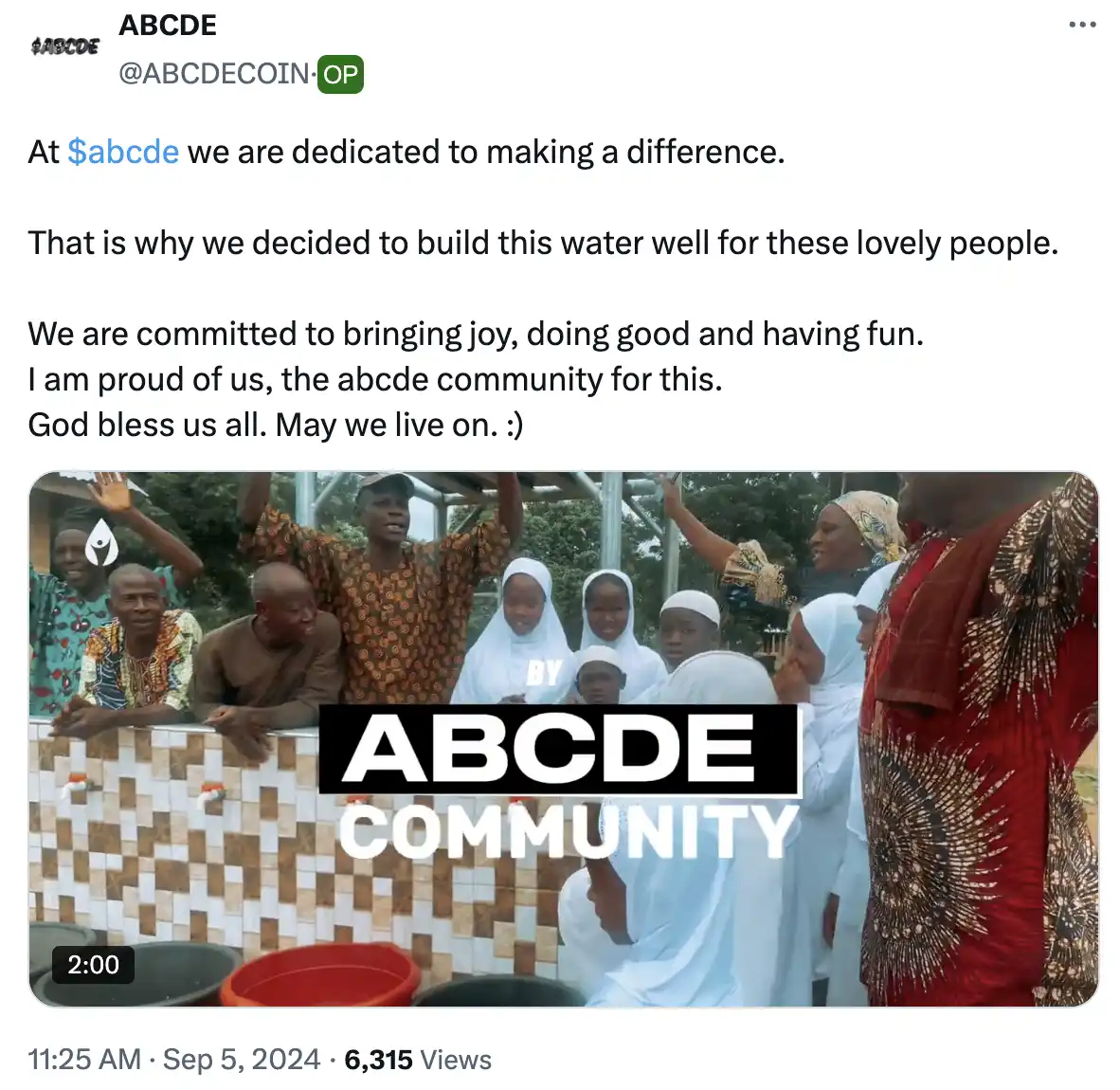 这些「业务」主要是向持有者展示项目方回购代币的资金来源,除此之外,abcde 还推进了慈善工作,与比特币曼德拉基金会合作在尼日利亚的一个村庄捐了一口水井,为当地居民提供了未来 30 年的饮用水。在文档中,abcde 还表示将在未来继续实现翻修学校、赞助运动队等慈善举措。