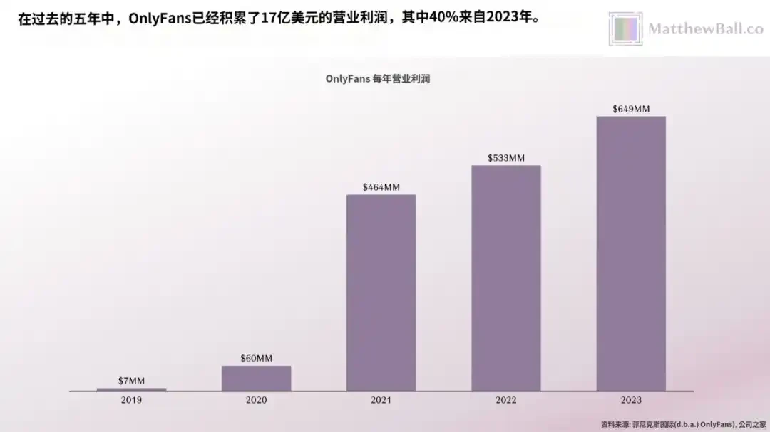 尽管 80% 的总收入转给了创作者,但 OnlyFans 产生了相当可观的利润。在 2023 年,该平台的净收入为 13 亿美元,毛利润为 8.19 亿美元(至少有一半的 4.88 亿美元销售成本将用于信用卡手续费,其余大部分与带宽、服务器等有关)。在所有开销之后,营业利润为 6.49 亿美元(占净收入的 50% 和总收入的 10%),过去五年总计为 17.4 亿美元。