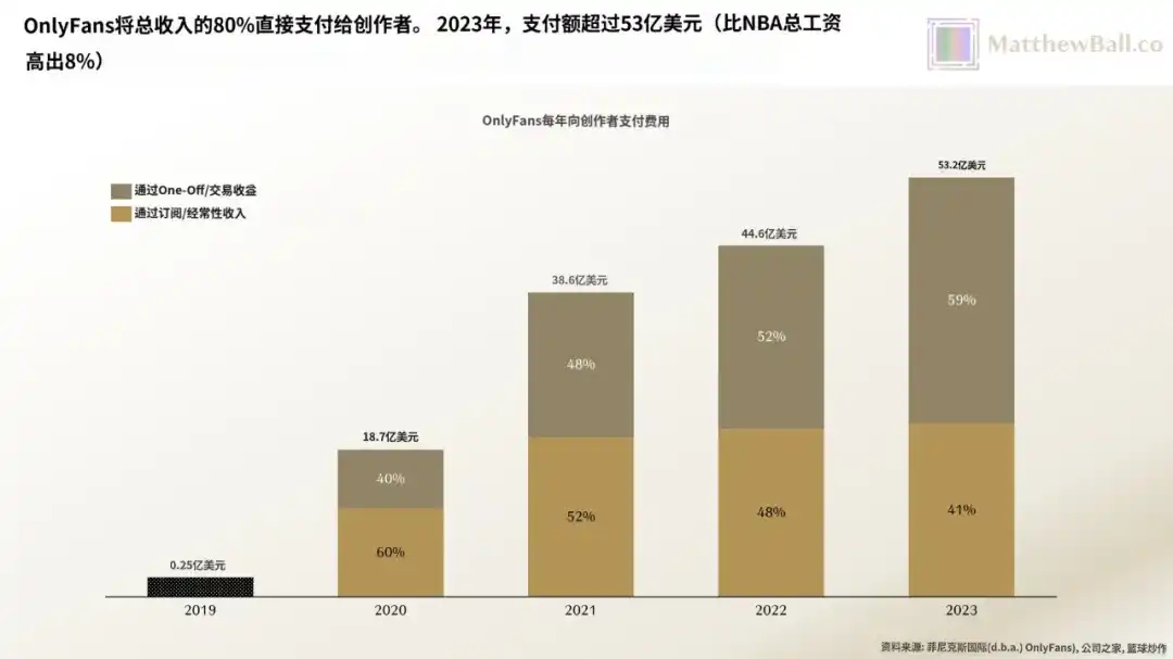 在 2023 年,OnlyFans 创作者收到了惊人的 53 亿美元的支付。作为比较, 2023-2024 赛季 NBA 的总薪水为 49 亿美元,而 NFL 的上限为 72 亿美元。在过去的五年里,OnlyFans 创作者总共收集了超过 150 亿美元。当然,这些联赛每个都有 500-1, 700 名玩家,而 OnlyFans 拥有大约 410 万创作者。