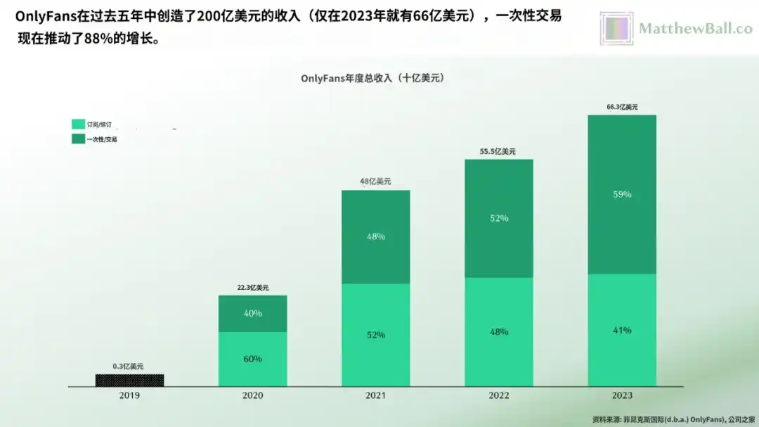 2023 年, OnlyFans 的年收入已达到惊人的 66 亿美元,五年前的收入是 3 亿美元。 虽然疫情期间的爆发性增长不太可能重现,但 2023 年的收入依然比前一年增长了 19% ,也就是 11 亿美元,这比 2022 年的增速还快了 3 个百分点。尽管平台以订阅为基础,但现在超过 60% 的消费现在通过一次性交易完成,而且这些交易金额并不小,常常高达几十美元。