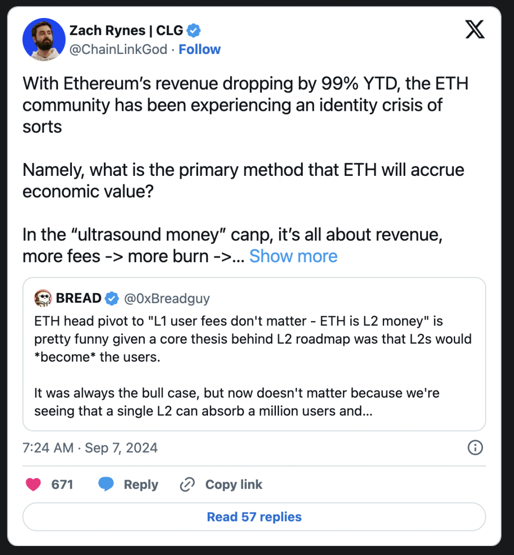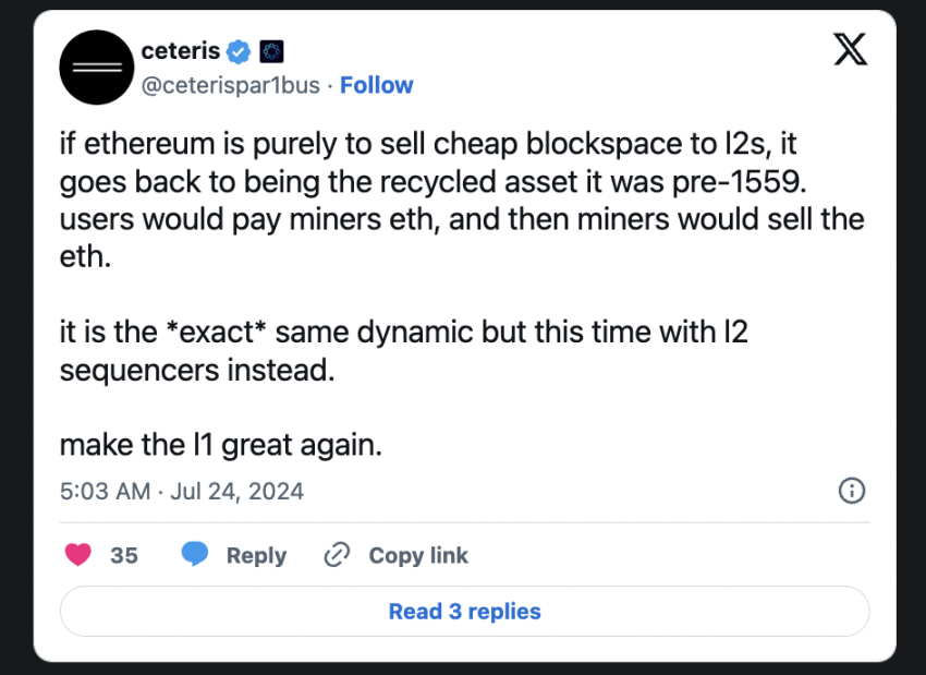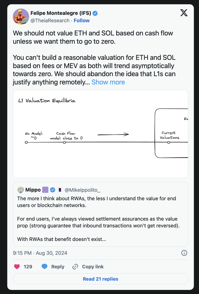 我们回到之前的问题:为什么人们试图再次扩展 L1 规模并提高 L1 费用?这是否正确?Theia 的 Felipe 认为,如果我们只是根据 MEV 和费用对 L1 代币进行估值,那么它们无论如何都会归零,因此唯一能证明其估值合理的东西就是成为「新兴市场储备资产」,即「货币」。我支持这个观点。