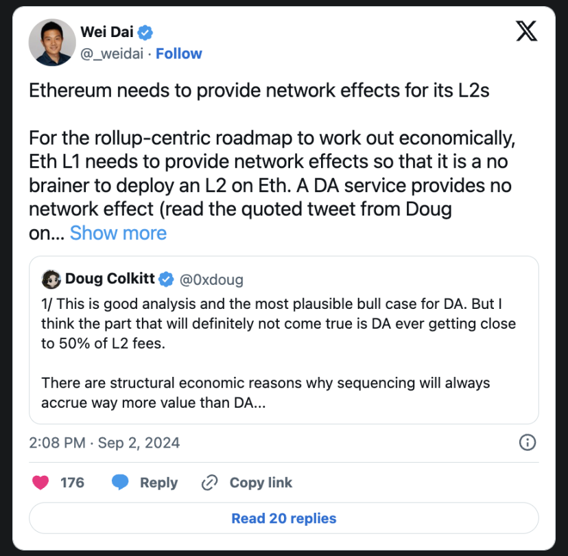 因此,以太坊 DA 费用收入的减少是自然而然的,它别无选择。现在,有些人开始质疑以太坊 Rollup 路线图,以 Max Resnick 和 Doug Colkitt 为代表。