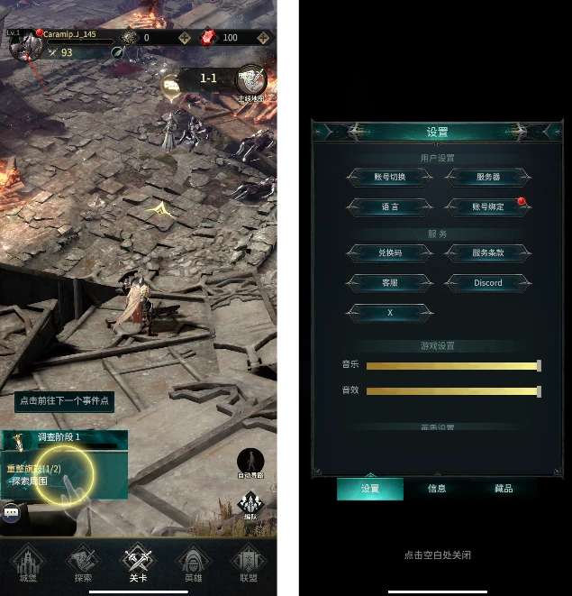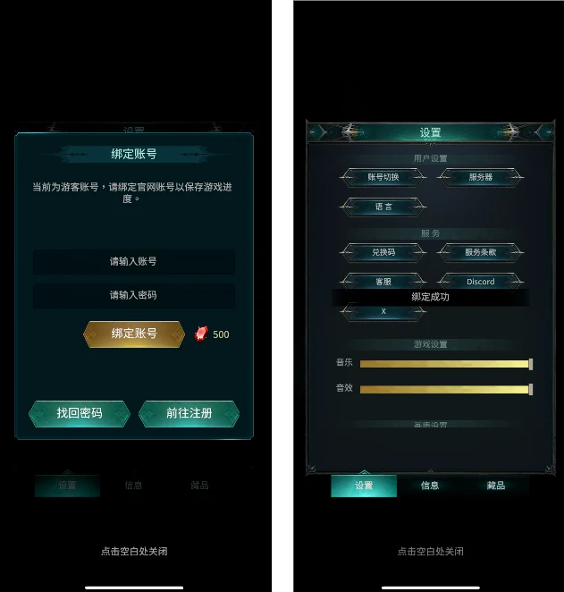 STEP 3. 进入游戏后,首先要绑定游戏账户:点击左上角人物头像,进入“设置”界面,点击“绑定账号”即可(账户需先在官网中通过邮箱注册),绑定完成后根据任务提示进行游戏。