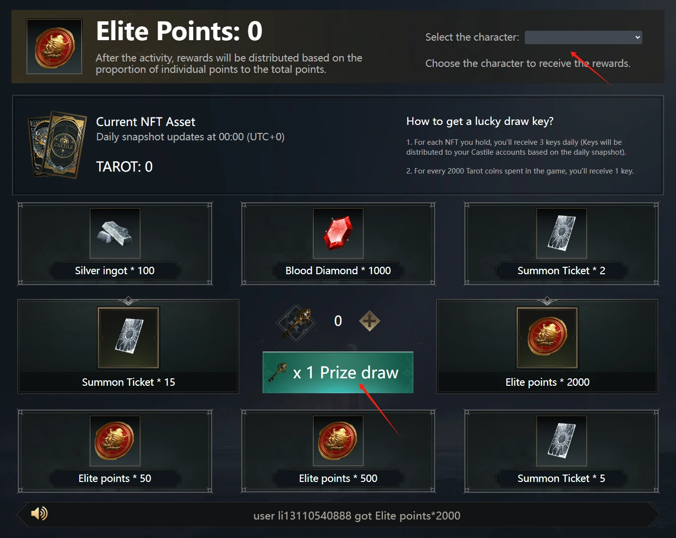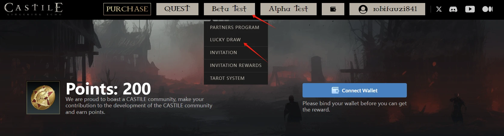 STEP 4. 点击上方“Beta Test”栏目中“LUCKY DRAW”,通过消耗“钥匙”参与抽奖(需先下载游戏,此处需绑定角色)。