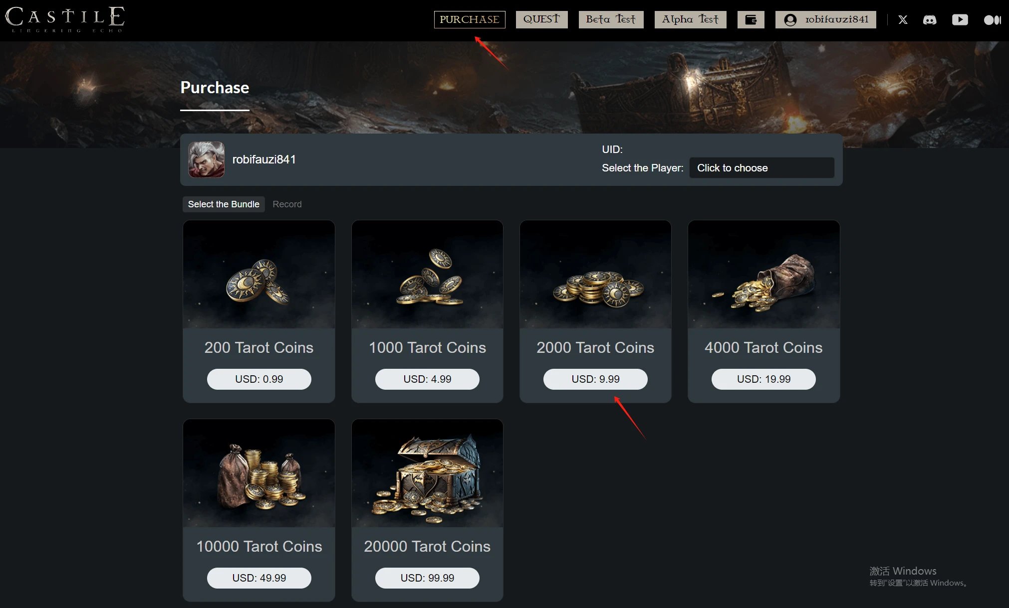 STEP 5. 点击上方“PURCHASE”栏目,可购买游戏代币 Tarot Coins,每在游戏中消耗 2000 枚 Tarot Coins,即可获得一次抽奖机会, 2000 枚游戏代币需要花费 9.99 美元。