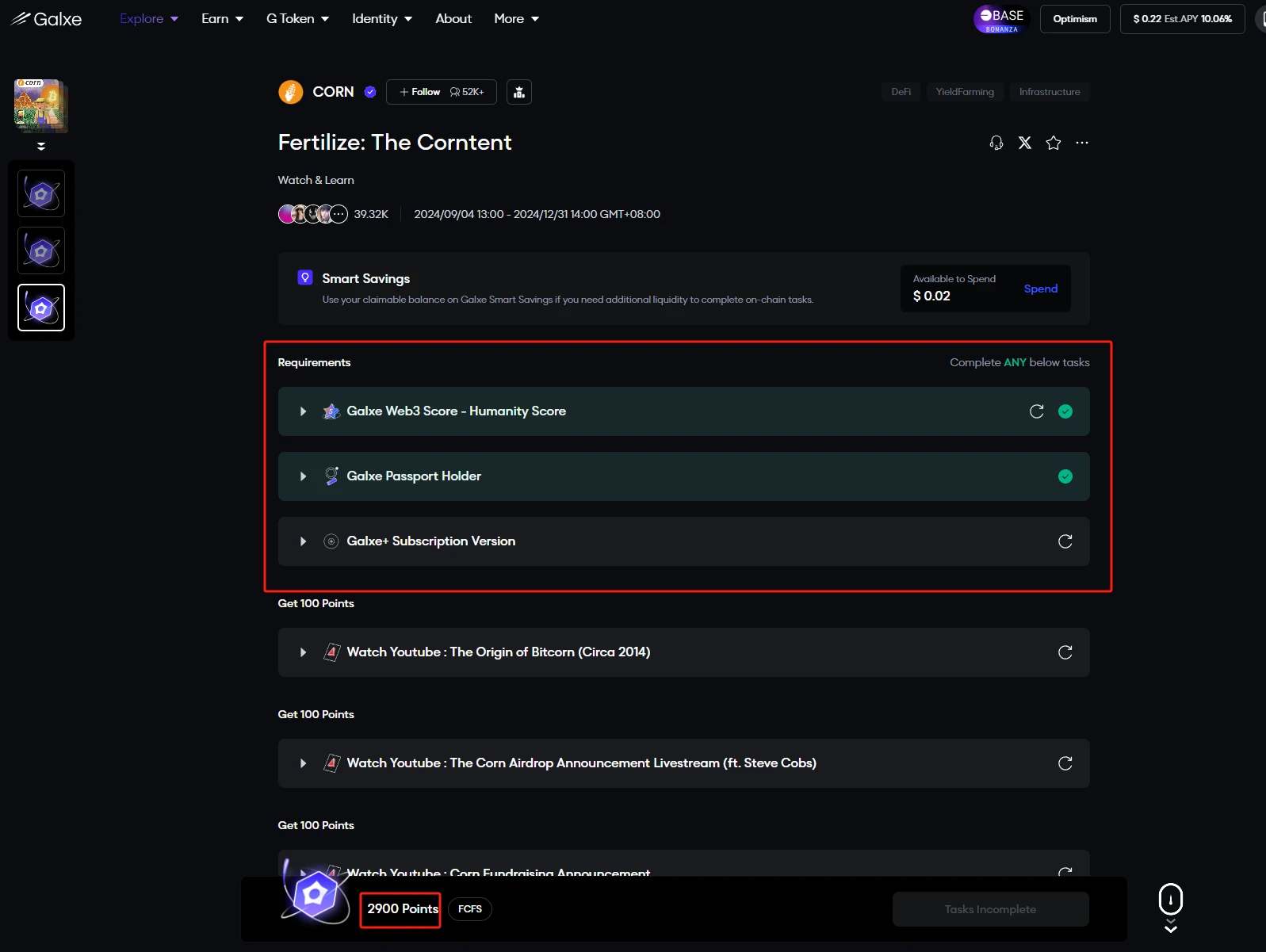 此任务为 Corn 在 Galxe 上的任务,任务极其简单,只需观看视频即可,共 2900 积分,但完成此任务需要持有 Galxe Pass 卡。