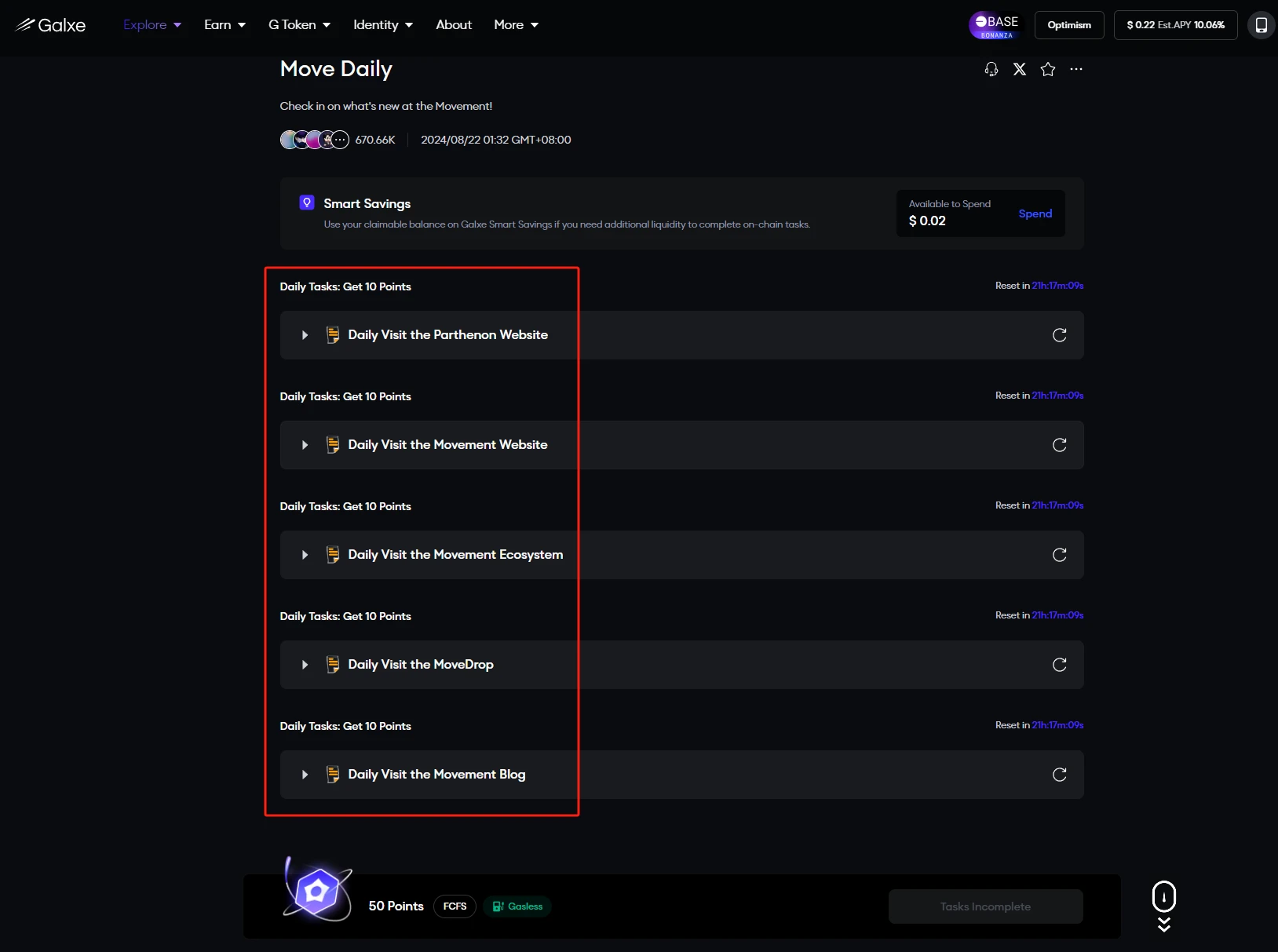 此任务为 Movement 在 Galxe 上每日任务,任务极其简单,只需点击对应的网站即可完成。完成任务后可以获得 50 积分。如果你是参与 Movement 其他交互活动的小伙伴,建议每天花几分钟完成 Galxe 上的每日任务,获得更多积分。
