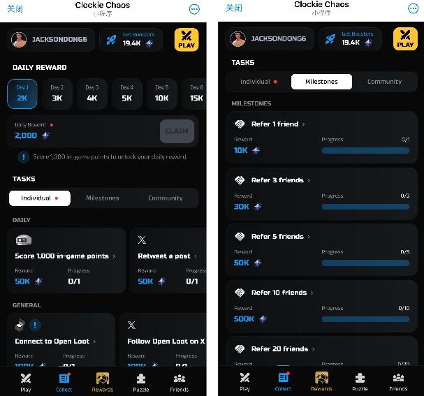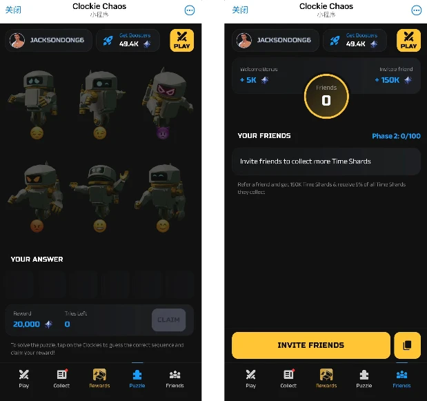 STEP 4. 点击下方”Puzzle“、”Friends“栏目分别对应每日解密(类似于仓鼠小游戏中的解密)、邀请好友,均可获得更多时间碎片积分。