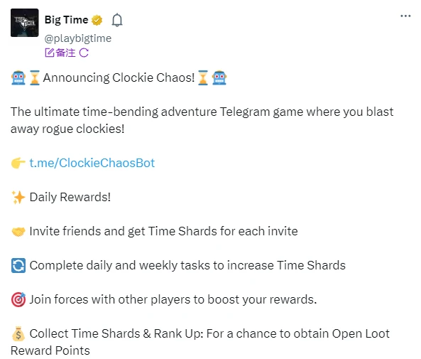 根据 Big Time 在 X 平台所发信息,目前玩家可以通过参与 Clockie Chaos Telegram 游戏获得时间碎片积分,未来或许是 Open Loot 代币空投的依据或可以兑换 Big Time 中游戏道具。