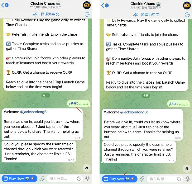 STEP 1. 进入交互网站,回复”start“后点击下方“Play Now”进行游戏小程序(仅能在手机端进行)。